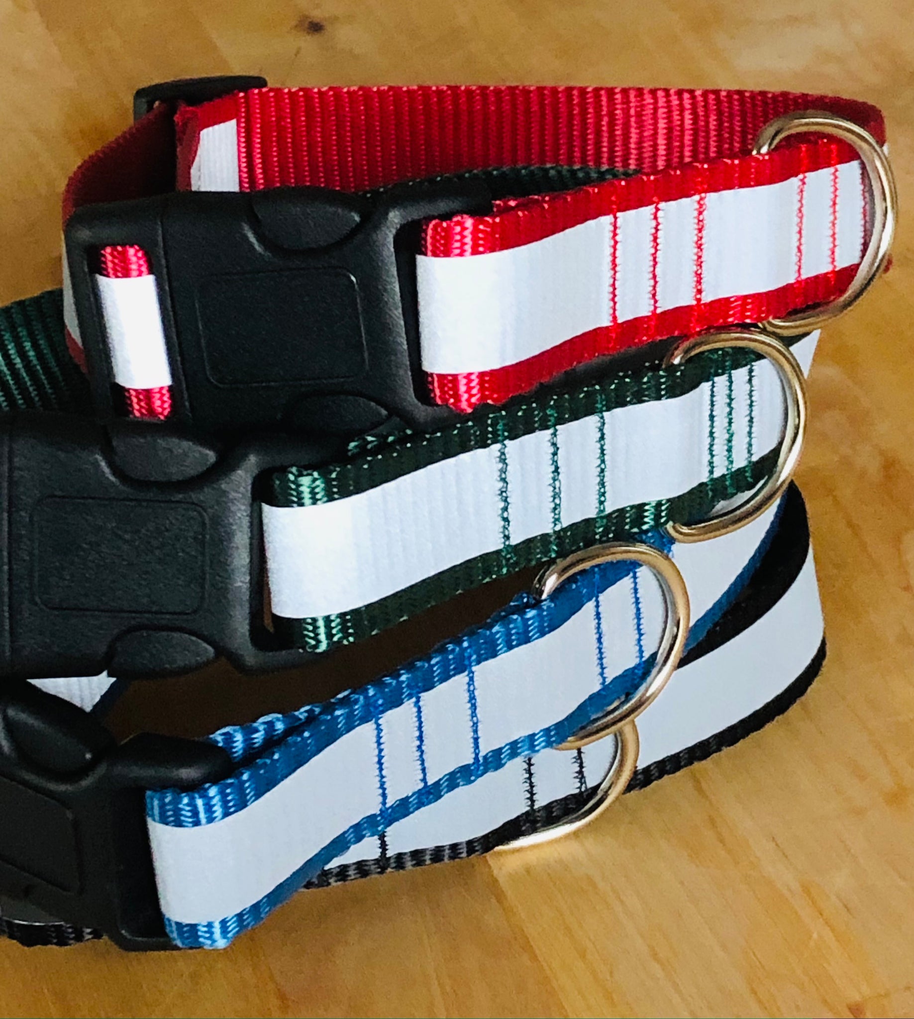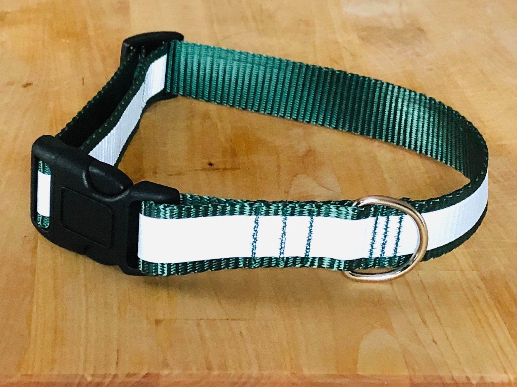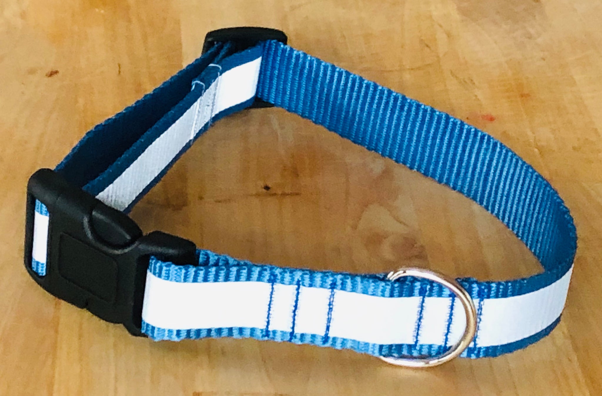 These collars have a highly reflective strip heat-bonded to the outside edge which appears bright white when a light shines on it in the dark. A great safety feature to keep your pup safe when walking in dark or low-light conditions.